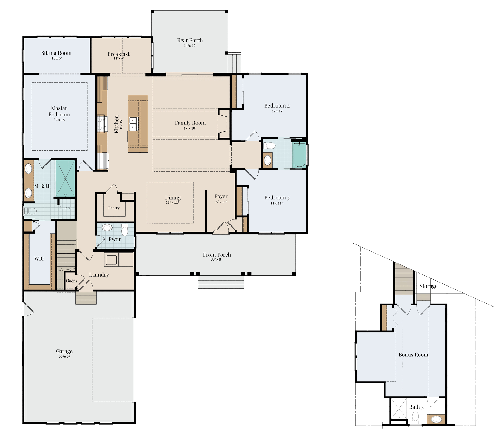 - First-floor primary suite with private bath, walk-in closet, and optional sitting area