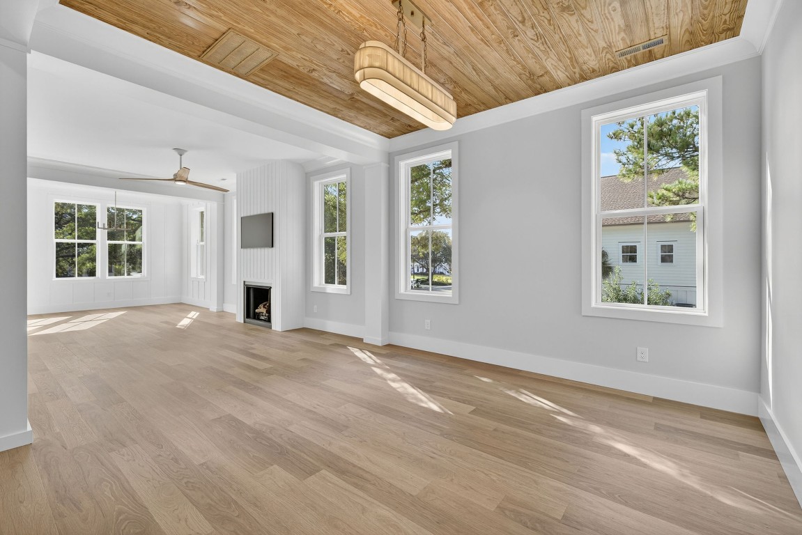 - Shiplap-accented gas fireplace