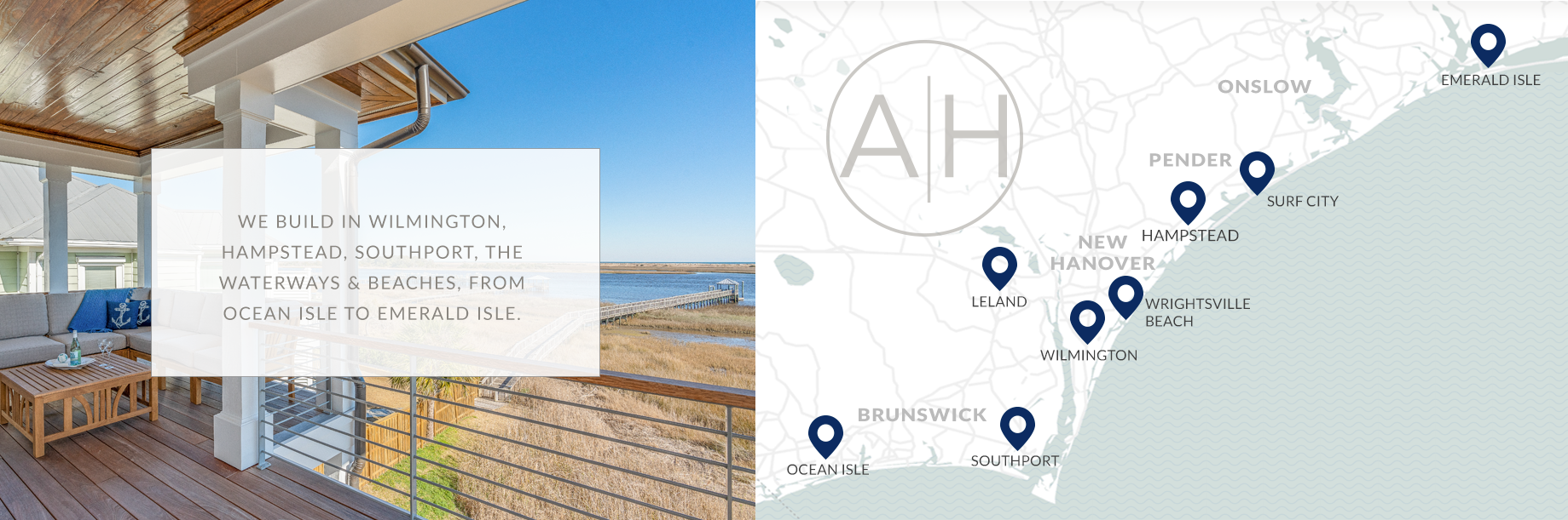 From Jacksonville to the South Carolina line, Airlie Homes proudly builds custom residences in some of the most desirable coastal communities in the Carolinas. Whether you’re drawn to the vibrant energy of Wilmington, the coastal charm of Southport, or the peaceful pace of Hampstead, each area we serve offers a unique lifestyle and natural beauty that perfectly complements the homes we create.